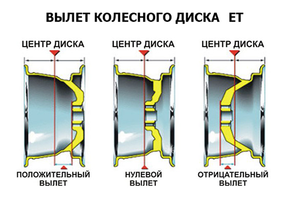 Что касается размера вылета, он считается равным нулю, если совпадают все плоскости. Размер его регламентируется и может немного меняться в зависимости от выбранного обода. Размер важно строго учитывать, поскольку при отрицательном значении изделие будет задевать арку колеса при поворотах, а при положительном — обод будет находиться внутри арки.